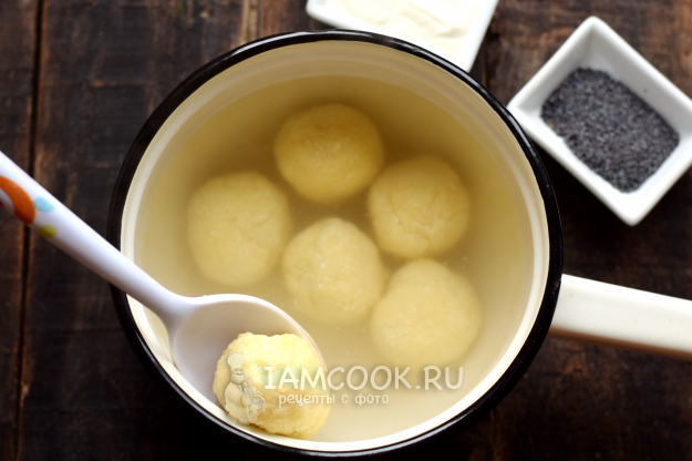 Заготовки поочередно укладывайте в бурлящую воду. Когда шарики всплывут на поверхность, варите их 1 минуту. Не варите сразу много экземпляров, иначе они слипнутся.
