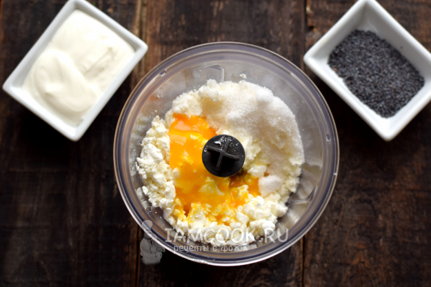 В чашу блендера поместите творог, вбейте яйцо, всыпьте сахар и щепотку соли.