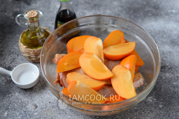 И нарезанную тонкими ломтиками хурму. Хорошенько все перемешайте, оставьте мариноваться на какое-то время.