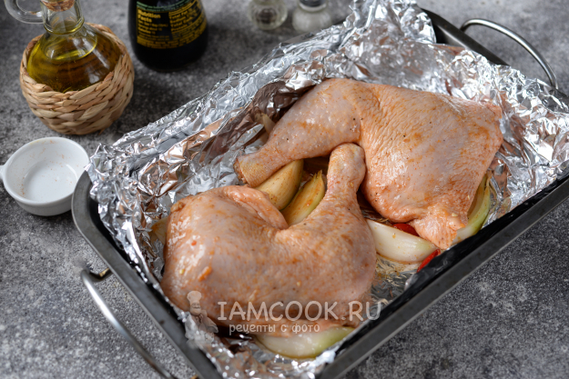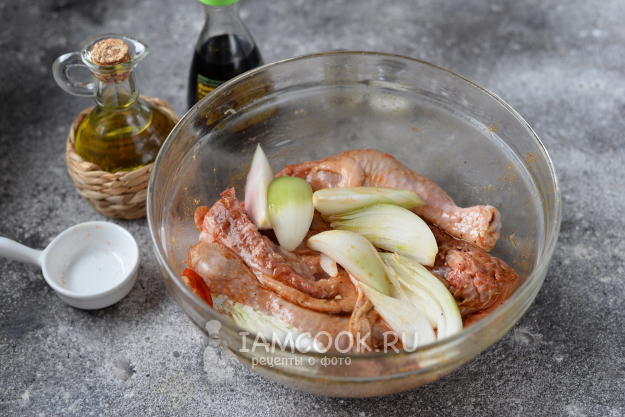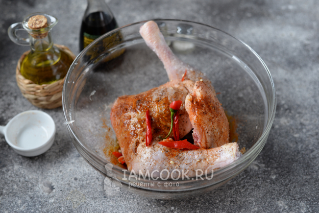 Сложите в глубокую миску куриные окорочка, влейте масло, лимонный сок, соевый соус. Добавьте соль, перец, приправу и жгучий перец.