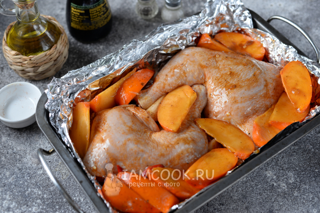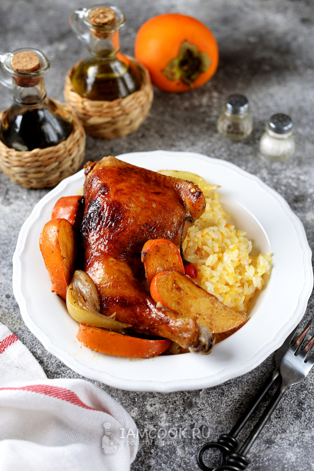 Спустя указанное время достаньте курицу с хурмой из духовки, разложите по порциям и подавайте с любимым гарниром.