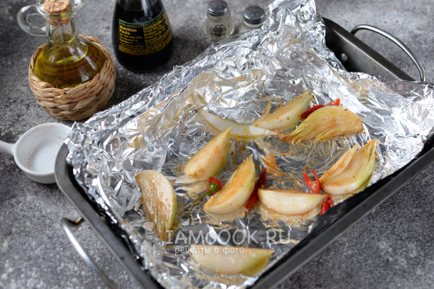 Форму для запекания выстелите фольгой, выложите слой лука.