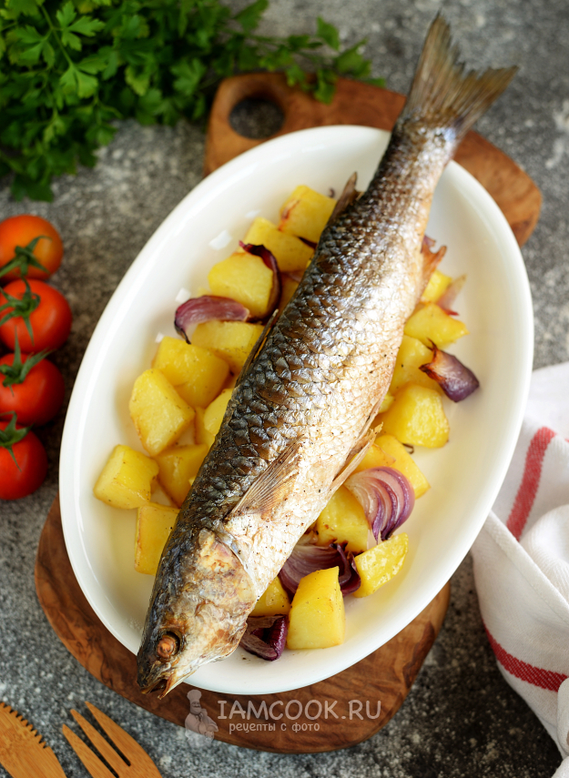 Спустя указанное время выложите запеченного в духовке пеленгаса с картошкой на порционное блюдо и подавайте к столу.