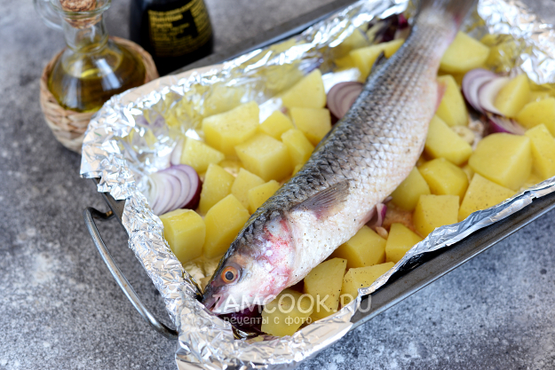 Выложите сверху слегка замаринованную тушку пеленгаса, полейте ее остатками маринада, чуть смажьте кожу постным маслом. Отправьте противень в предварительно разогретую до 190 градусов духовку на 40 минут.