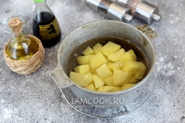 Картофель нарежьте крупным кубиком, залейте холодной водой, чуть посолите, отварите около 5 минут.