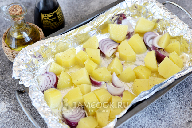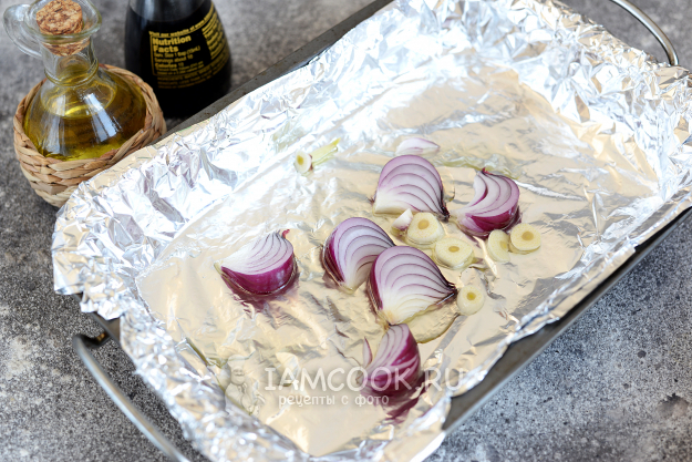Выстелите противень пищевой фольгой, влейте немного постного масла, положите на него нарезанный репчатый лук и чеснок.