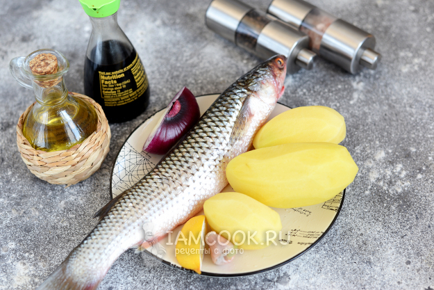 Подготовьте продукты для запекания пеленгаса с картошкой в духовке. Картофель, лук и чеснок почистите, помойте под проточной водой.
