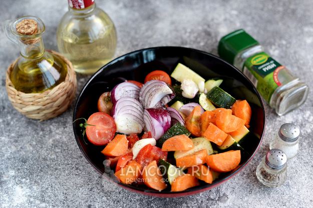 Нарежьте овощи крупными кусочками, сложите в глубокую миску, посыпьте солью, перцем, полейте постным маслом, чуть сбрызните их белым винным уксусом. Хорошенько перемешайте, отставьте пока в сторону.