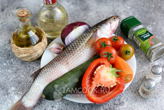 Для приготовления пеленгаса с овощами в духовке подготовьте все необходимые продукты по списку. Лук, чеснок и болгарский перец почистите, все овощи помойте, обсушите.