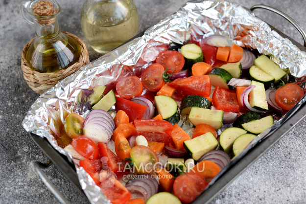 Выстелите форму фольгой, выложите замаринованные овощи.