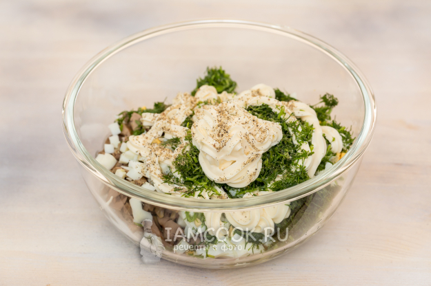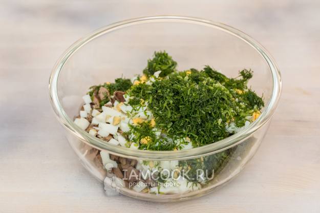 Добавьте нарезанные яйца и нарезанный мелко репчатый лук.