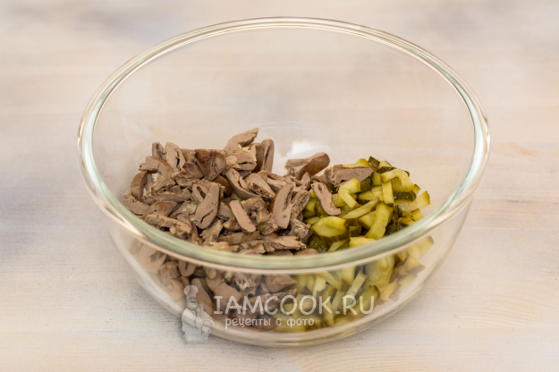 Отварите сердечки заранее. Просто отрежьте жир, который на них имеется, залейте водой и варите 20-30 минут. Проткните их тонким ножом или вилкой - они легко будут входить в сердечки. Яйца тоже отварите заранее.