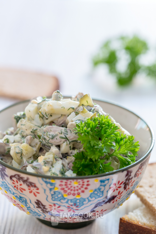 Салат с куриными сердечками и солеными огурцами отлично подойдет для ужина, в смысле, им вполне можно заменить ужин. Он сытный, вкусный.