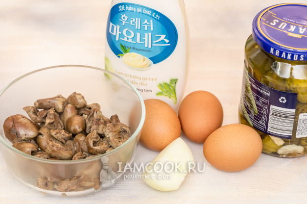 Для приготовления салата с куриными сердечками и солеными огурцами подготовьте продукты по списку.