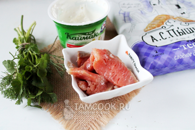 С малосольной красной рыбой отлично сочетается творожный сыр, я часто беру "Каймак", изюминку в начинку вносит добавление зелени кинзы и укропа.