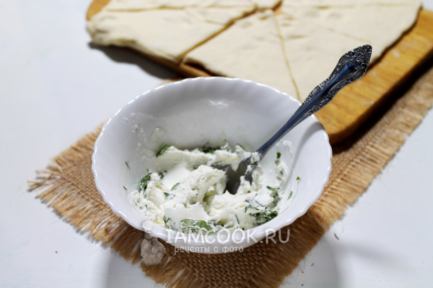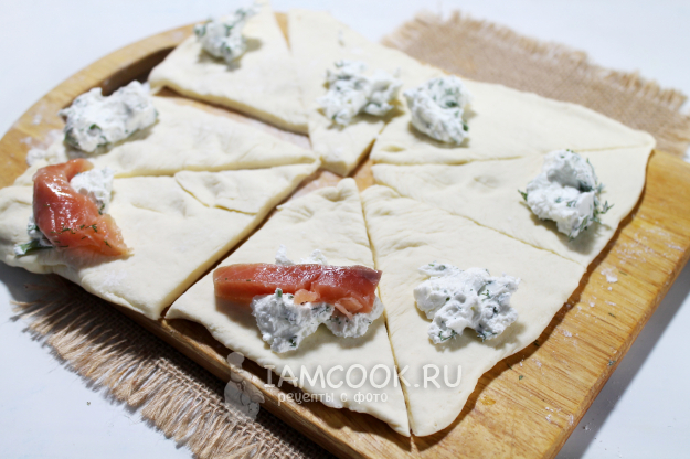 На широкий конец каждого полученного при нарезке треугольника выложите чайную ложку сырной начинки и ломтик рыбы.