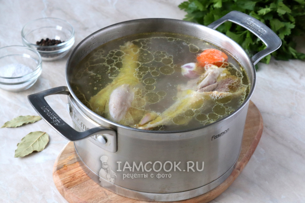Мясо тщательно промойте под холодной проточной водой. Если на коже остались участки с пёрышками, обязательно удалите их. Затем выложите части птицы в варочную ёмкость и залейте чистой фильтрованной водой. Доведите жидкость до кипения, снизьте огонь и снимите образовавшуюся пену.