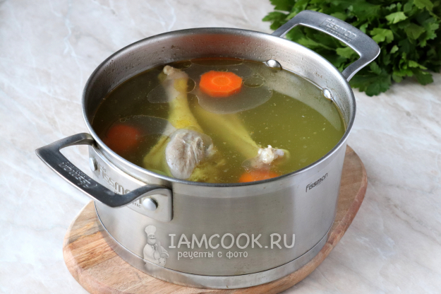 За 15 минут до окончания варки не забудьте бульон посолить, а также добавить горошины чёрного (душистого) перца и лавровые листы.