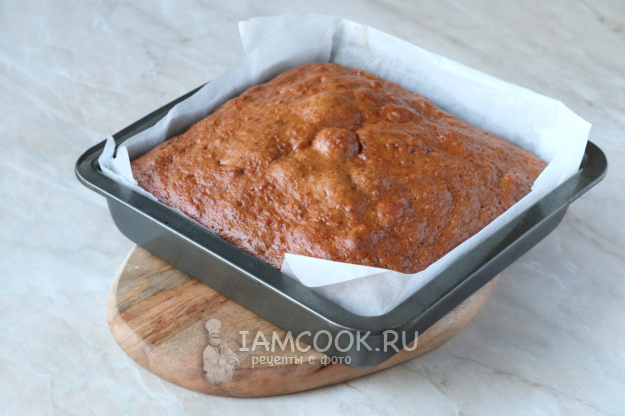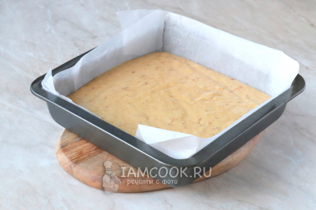 Жаропрочную форму застелите пергаментом и переложите тесто. Поверхность разровняйте силиконовой лопаткой.