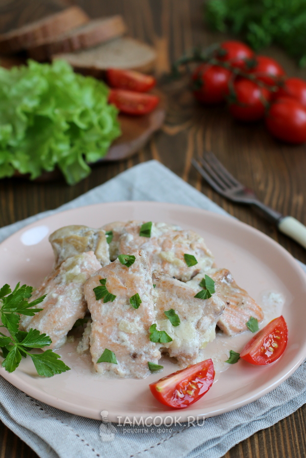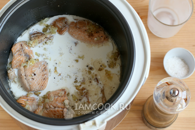 Также добавляем нарезанный мелко зубчик чеснока, заливаем все сливками. Ждём, пока все снова закипит, после чего готовим горбушу в сливках в мультиварке еще минут 7. После выключим мультиварку, закроем крышкой и дадим блюду настояться минут 5-10.