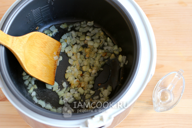 Теперь включаем в мультиварке режим "Выпечка", наливаем в чашу растительное масло и кладем нарезанный кубиком лук. Обжариваем до легкой румяности.