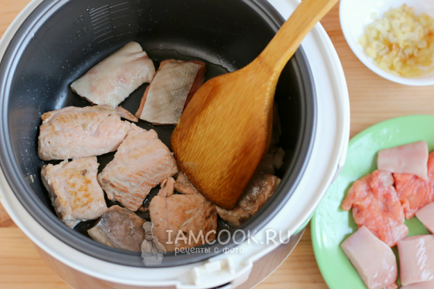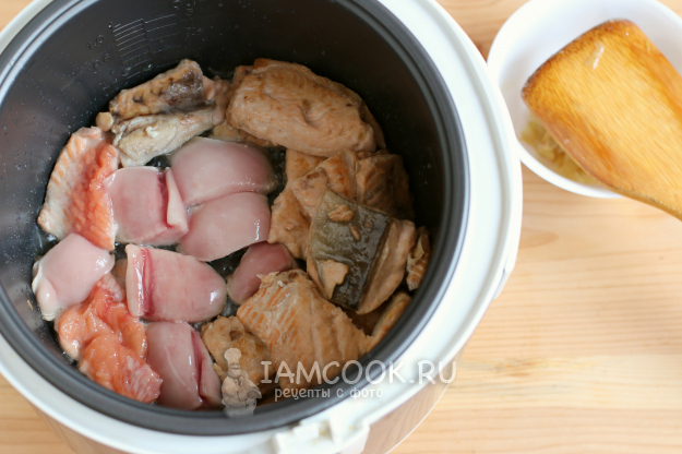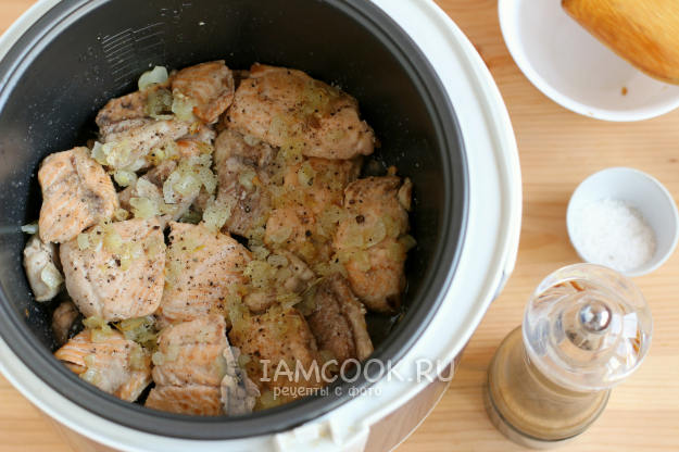 После уберем из чаши обжаренный лук и частями помещаем кусочки горбуши, чтобы они обжаривались равномерно, а не всей кучей. Так они не поломаются и сохранят свою форму. Если у вас мультиварка больше моей, то можно помещать сразу все кусочки. Обжариваем вначале с одной стороны, переворачиваем и обжариваем с другой стороны - буквально по две минуты, не дольше.