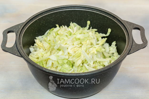 Капусту нарежьте произвольно, выложите в казан (кастрюлю, ковш), залейте водой и тушите до полного испарения жидкости.
