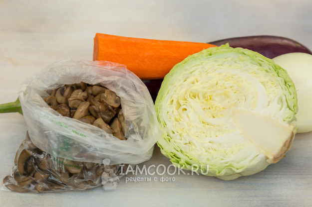 Для приготовления тушеной капусты с грибами и баклажанами подготовьте продукты по списку.