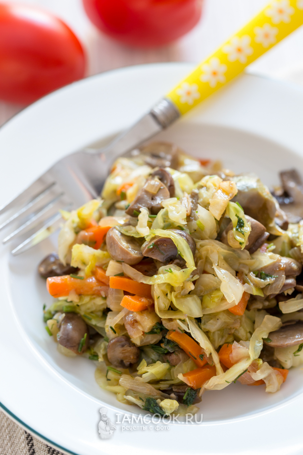 Капуста и овощи с грибами готовятся отдельно, а потом все смешивается, что, кстати, оказалось очень удобным вариантом приготовления такого блюда.