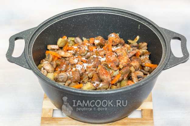 Грибы у меня были обжарены без масла, а затем заморожены. Если у вас грибы свежие, то лучше сначала обжарить их, а затем добавить остальные овощи, в противном случае грибы выделят много жидкости и всё будет в ней плавать.