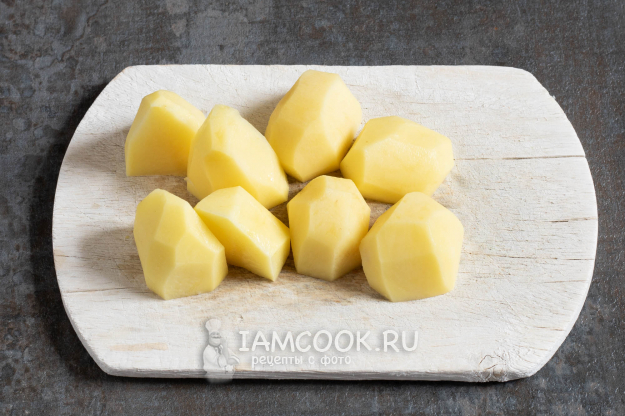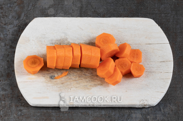 Чистим и режем крупными кусками морковь, добавляем к мясу и картошке, промешиваем.