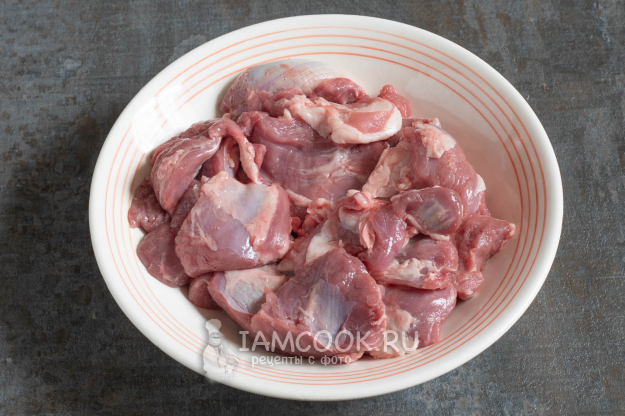 Баранину режем на куски, которые будет удобно есть с вилки за один-два укуса. Сразу после того как мясо нарезано, начинаем обжаривать его на среднем огне в небольшом количестве растительного масла, периодически промешивая, чтобы мясо равномерно схватилось со всех сторон.