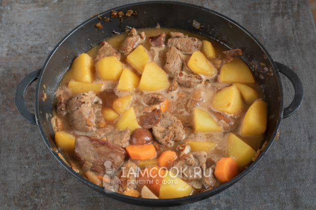 После закипания воды огонь под бараниной с картошкой и грибами следует убавить до минимума и тушить рагу около часа (до достижения картошкой и бараниной мягкости.