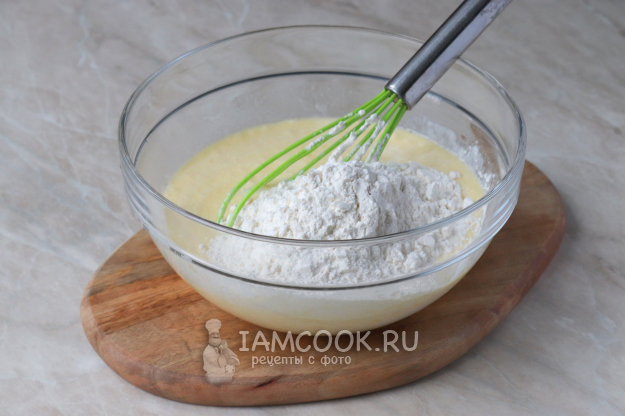 Тщательно перемешайте и введите просеянную пшеничную муку.