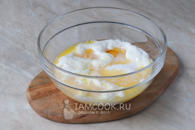 Тем временем растопите сливочное масло (на водяной бане или в микроволновой печи) и дайте ему немного остыть. После того как в миске между сметаной и разрыхлителем произойдёт реакция и масса заметно увеличится в объемах, добавьте туда же куриные яйца, сахар и растопленное сливочное масло.
