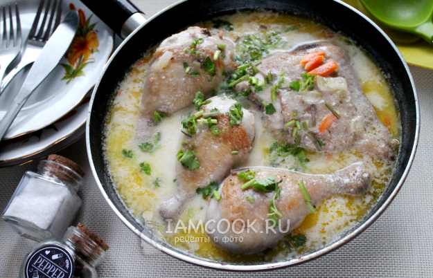 Подавайте тушеные куриные голени в сметанном соусе в горячем виде, присыпав мелко нарезанной зеленью.