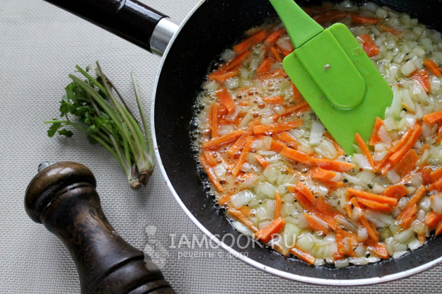 Пока курица обжаривается, мелко порежьте лук и морковь.