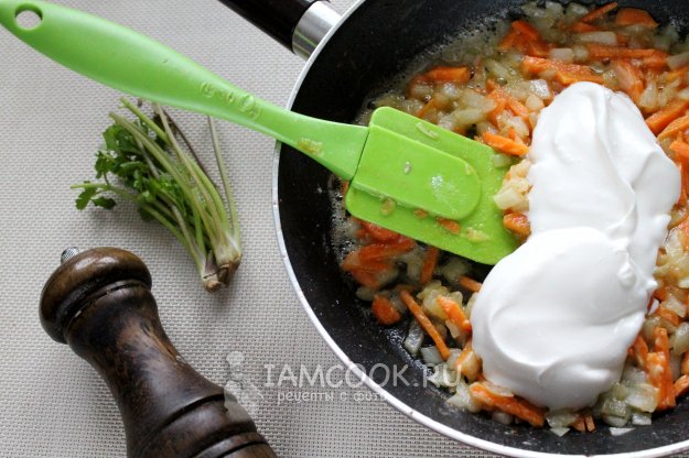 Добавьте сметану и полстакана воды. Потушите все вместе минутки 3.