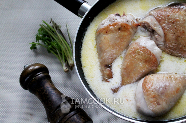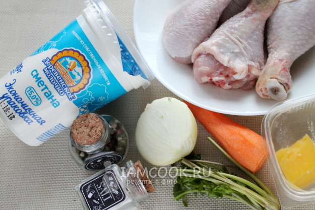 Продукты для приготовления куриных голеней на сковороде в сметанном соусе подготовьте по списку ингредиентов.