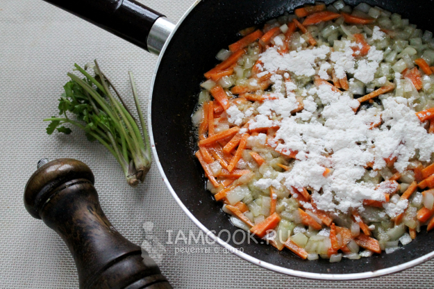 Добавьте немного муки, насыпая ее тонким слоем и вмешивая в масло.