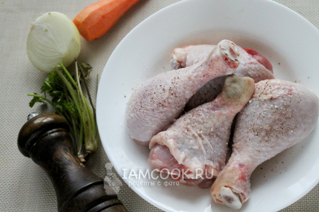 Куриные голени хорошо помойте, обязательно обсушите салфеткой, посолите, поперчите, хорошо перемешайте, втирая смесь в мясо, дайте постоять минут 5.