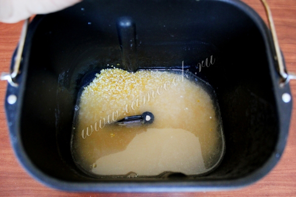 Поместите кукурузную крупу в контейнер хлебопечки, добавьте оливковое масло, влейте воду.