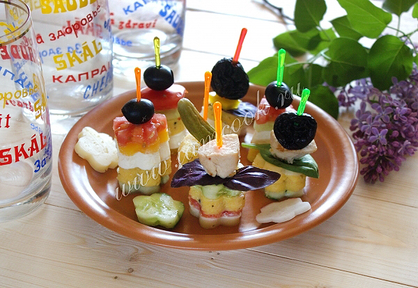 Также из поленты можно приготовить канапе с сыром, овощами, колбасами и мясом.