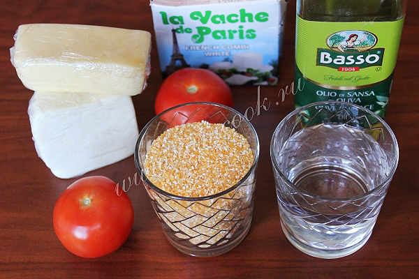 Подготовьте кукурузную крупу, воду, оливковое масло и то с чем будете подавать, например, сыры и овощи.