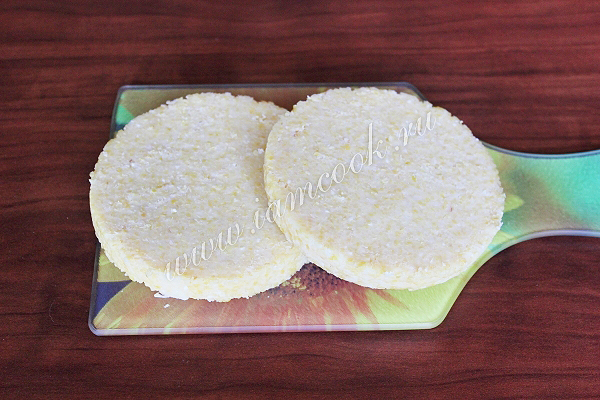 Эта полента будет использована как заготовка для пиццы, поэтому готовую разрезала на несколько лепешек.