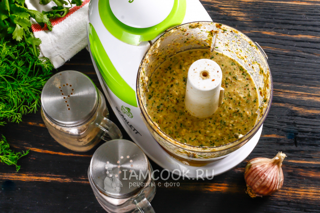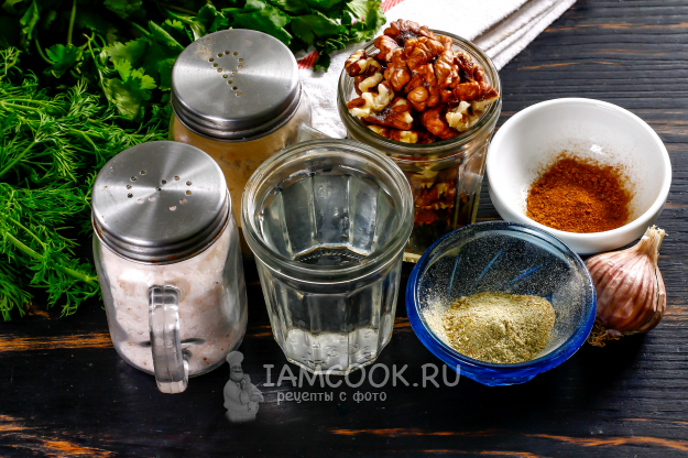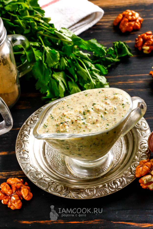 На сухой сковороде чуть поджарить орехи, очистить от кожуры, перекрутить на мясорубке, приготовить специи уцхо сунели, то есть пажитник голубой, далее кориандр, далее чуть-чуть перец черный молотый, имеретинский шафран молотые, внести в молотые орехи, затем добавить перец чили очищенный, внутри которого вложен чеснок, и все повторно перекрутить через мясорубку. К полученной плотной массе постепенно добавлять кипяченую охлажденную воду до густоты сметаны, дать постоять. Подходит к курице, к индейке прекрасно, к палтусу отварному. Свежую кинзу нужно очень мелко измельчить и добавлять чуть-чуть уже после загустения соуса.