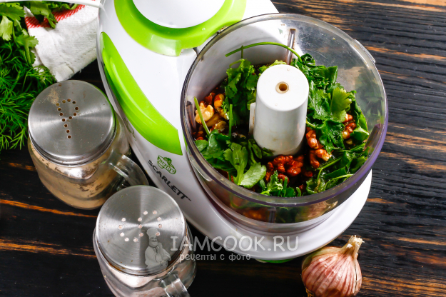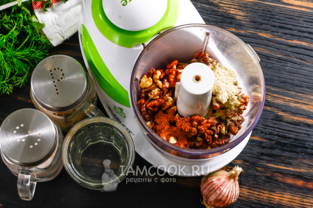Ядра грецких орехов засыпьте в чашу измельчителя или блендера, кухонного комбайна. Всыпьте туда же уцхо-сунели (не меняйте пряность на хмели-сунели, это будет не тот вкус!). Всыпьте соль, молотый красный жгучий перец.