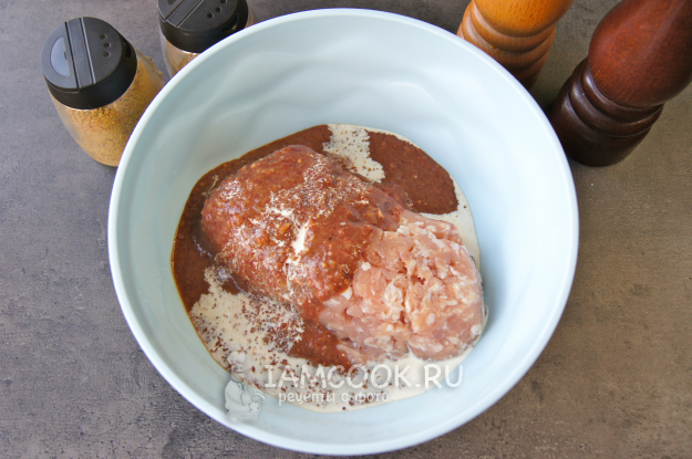 У меня был готовый свиной фарш, поэтому я измельчила при помощи блендера печень с луком и чесноком, затем соединила все вместе, посолила, поперчила, добавила муку, сливки и хорошенько перемешала рукой. Готовый фарш накрыла пищевой пленкой и поставила в холодильник на 1 час.