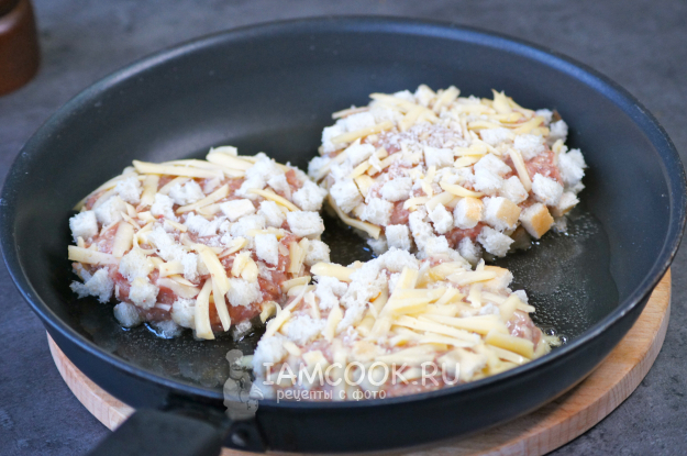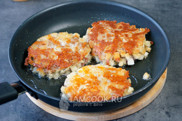 Убавила огонь на минимум, перевернула котлеты и обжарила до румяности с другой стороны.