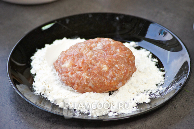 Из фарша сформировала котлеты круглой формы, обваляла в муке.